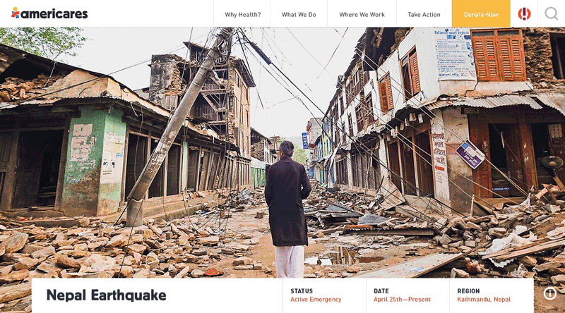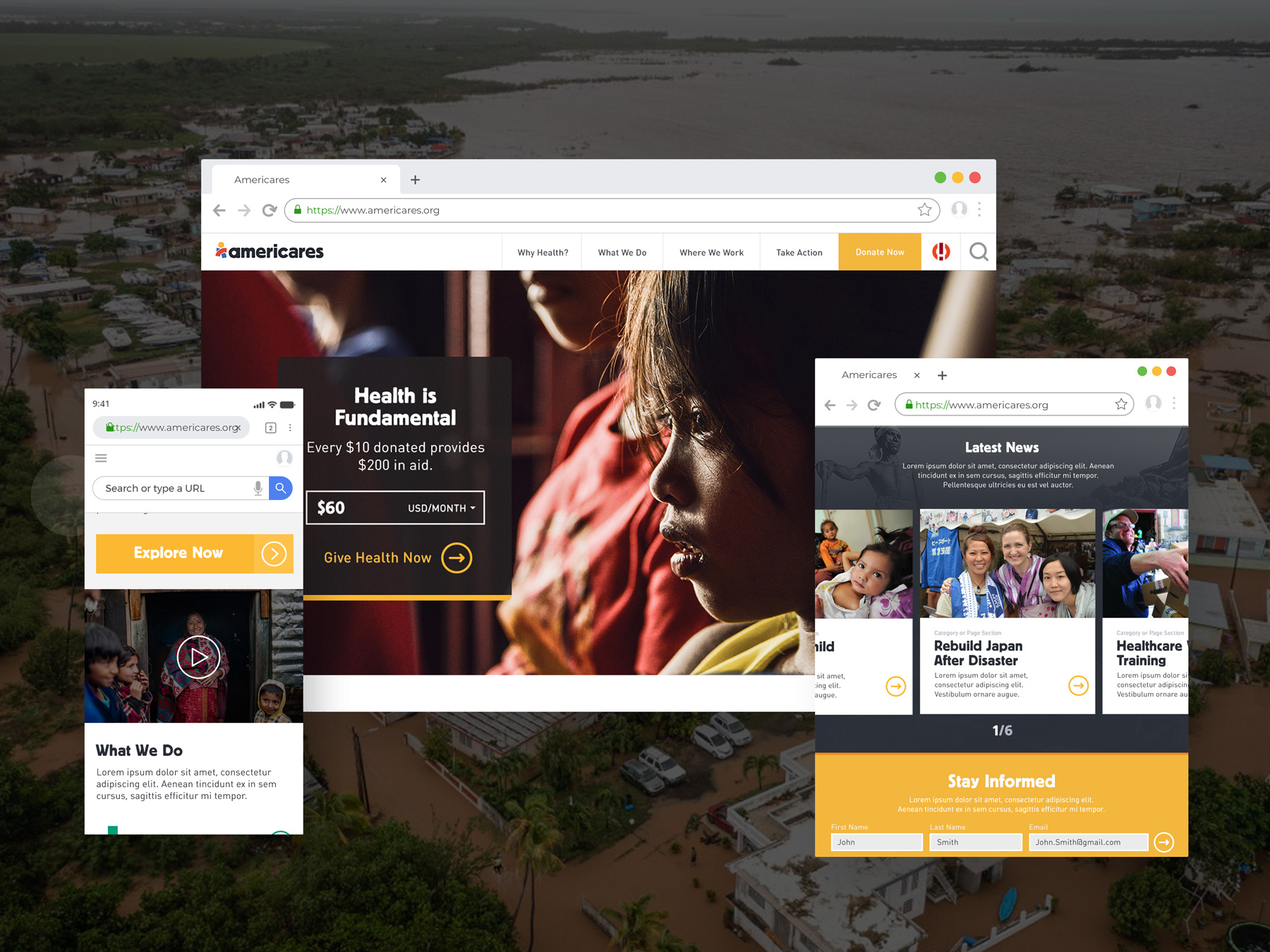 On September 12, 2016, Americares unveiled a new logo and visual identity that’s reflective of its growth and transformation to a global organization and a key player in the global health field. The rebranding came at a time when Americares, best known for its emergency relief work and medical aid deliveries, was expanding its programming to include more health services in under-resourced countries. Our tiny team three paired up with a branding agency to realize and take the design to market and provide a whole new experience – taking point in leading several front-end needs.