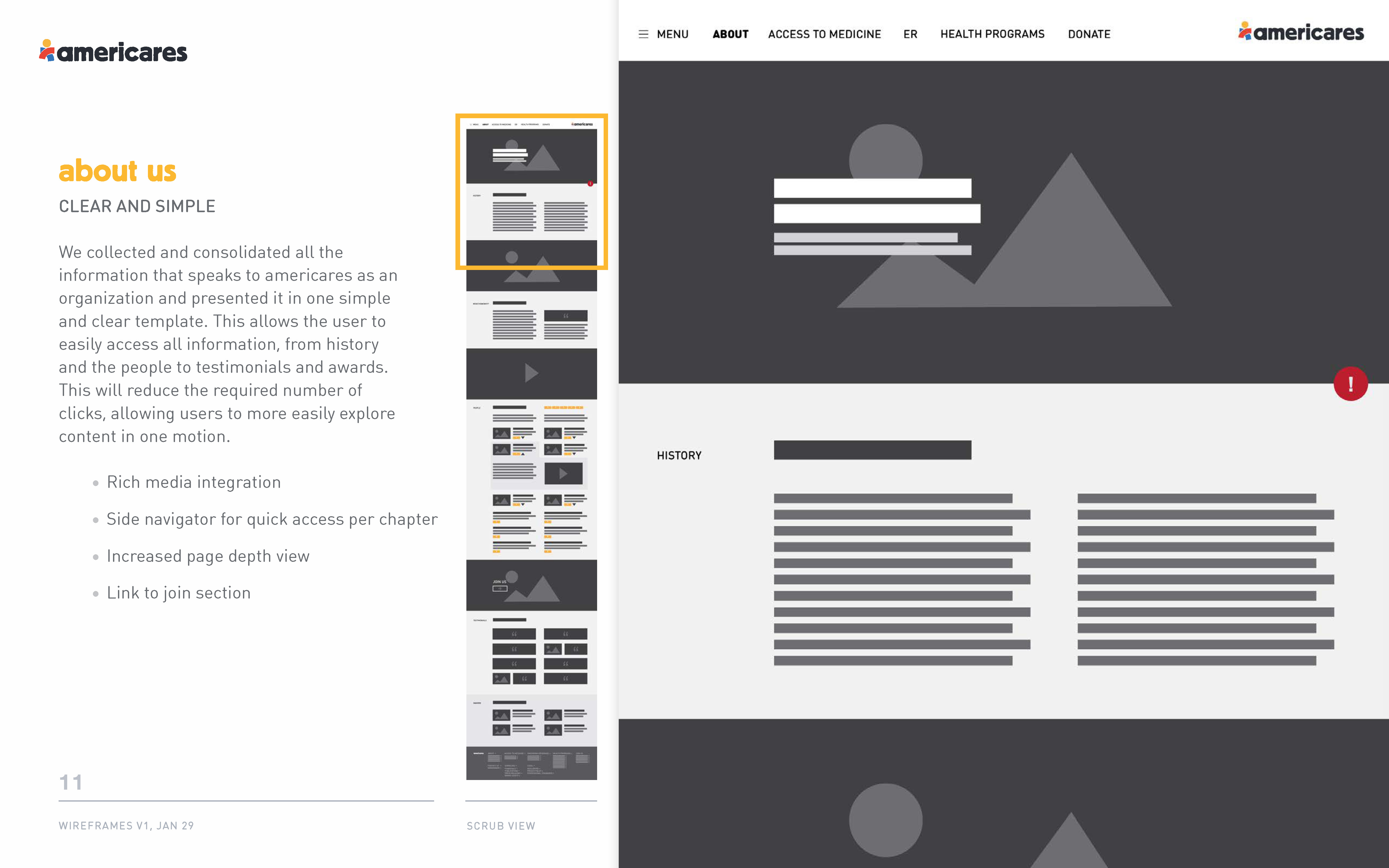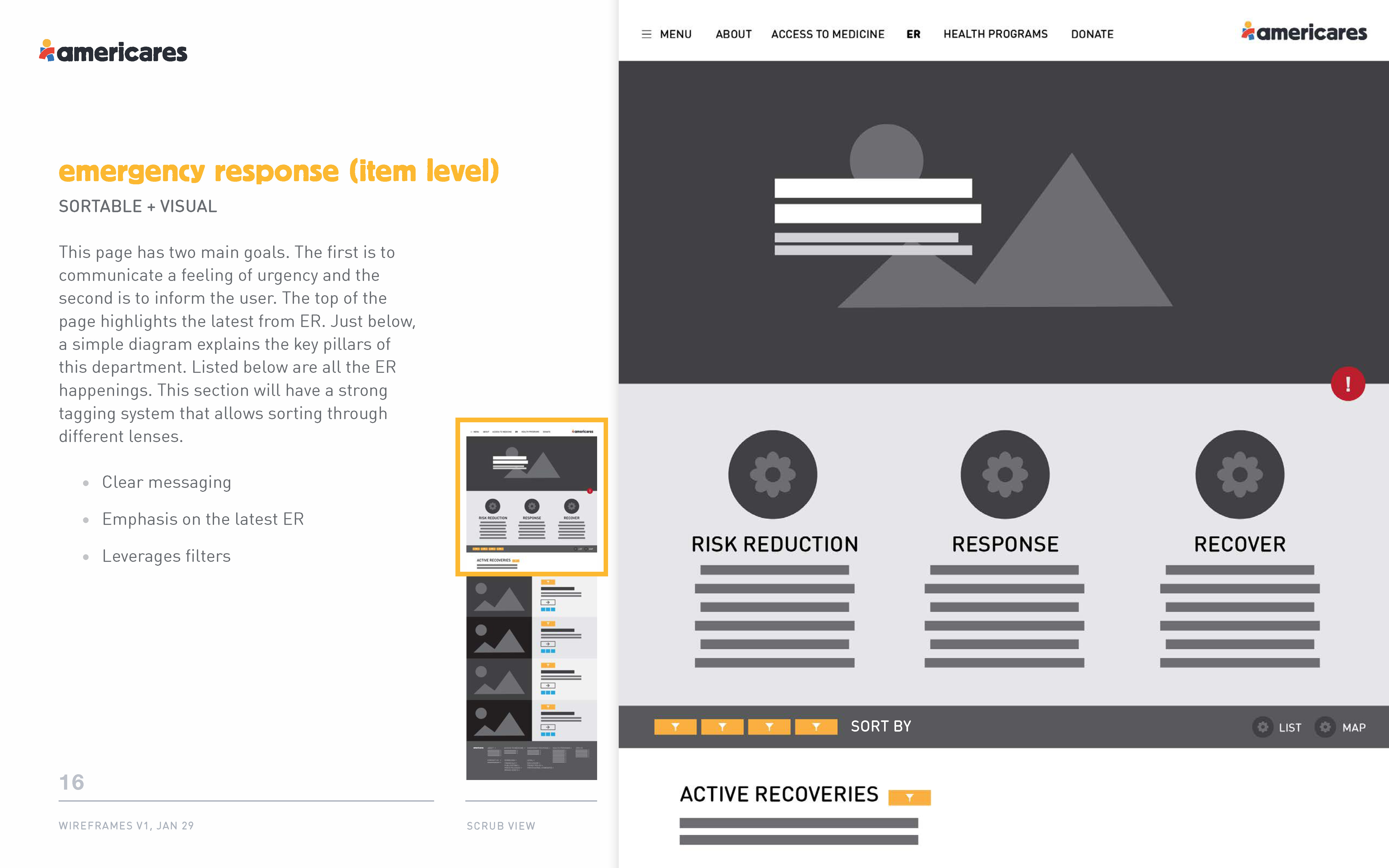 We designed low fidelity mockups of key features for our Desktop, Tablet and Mobile interface breakpoints including in depth notes on planned activities for each feature. We found that most of our previous site needs were still needed but years later our users valued additional interactivity and information scent that is (1) proactively utilized and (2) personalized to the situational context.